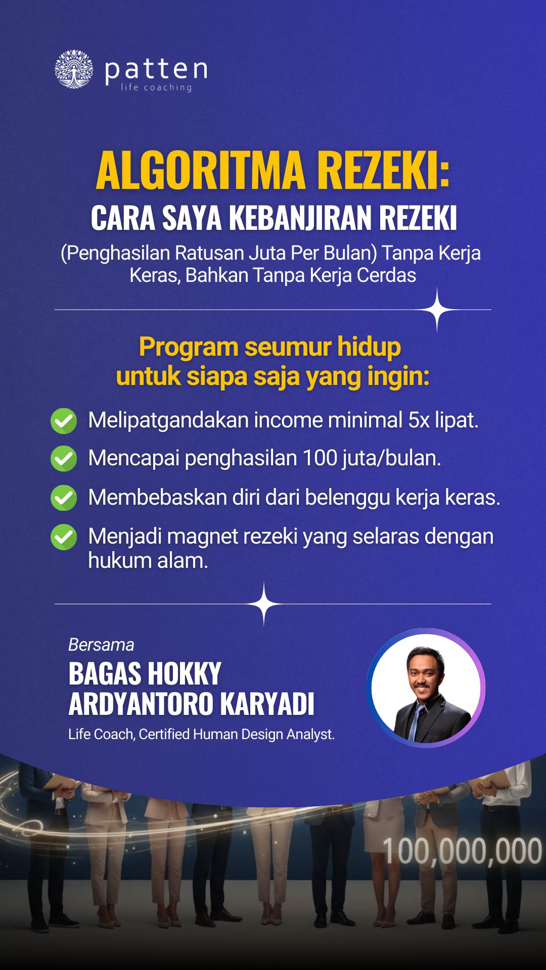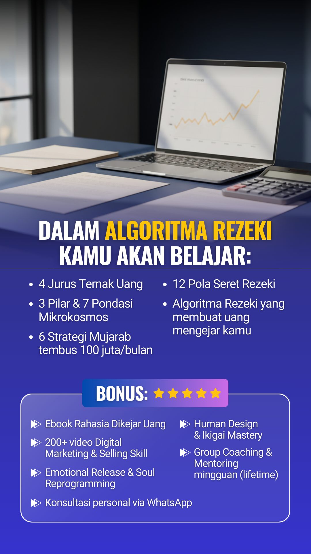 Membership 1 BULAN berisi modul, praktik, dan mentoring rutin untuk aktivasi rezeki: mindset, energi, hingga strategi jualan.